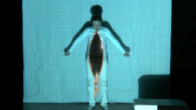 The artwork is a monologue in interaction with a 2D animation film, a funny and ab-surd and magical retelling of the Frankenstein myth where the creature becomes the master.
